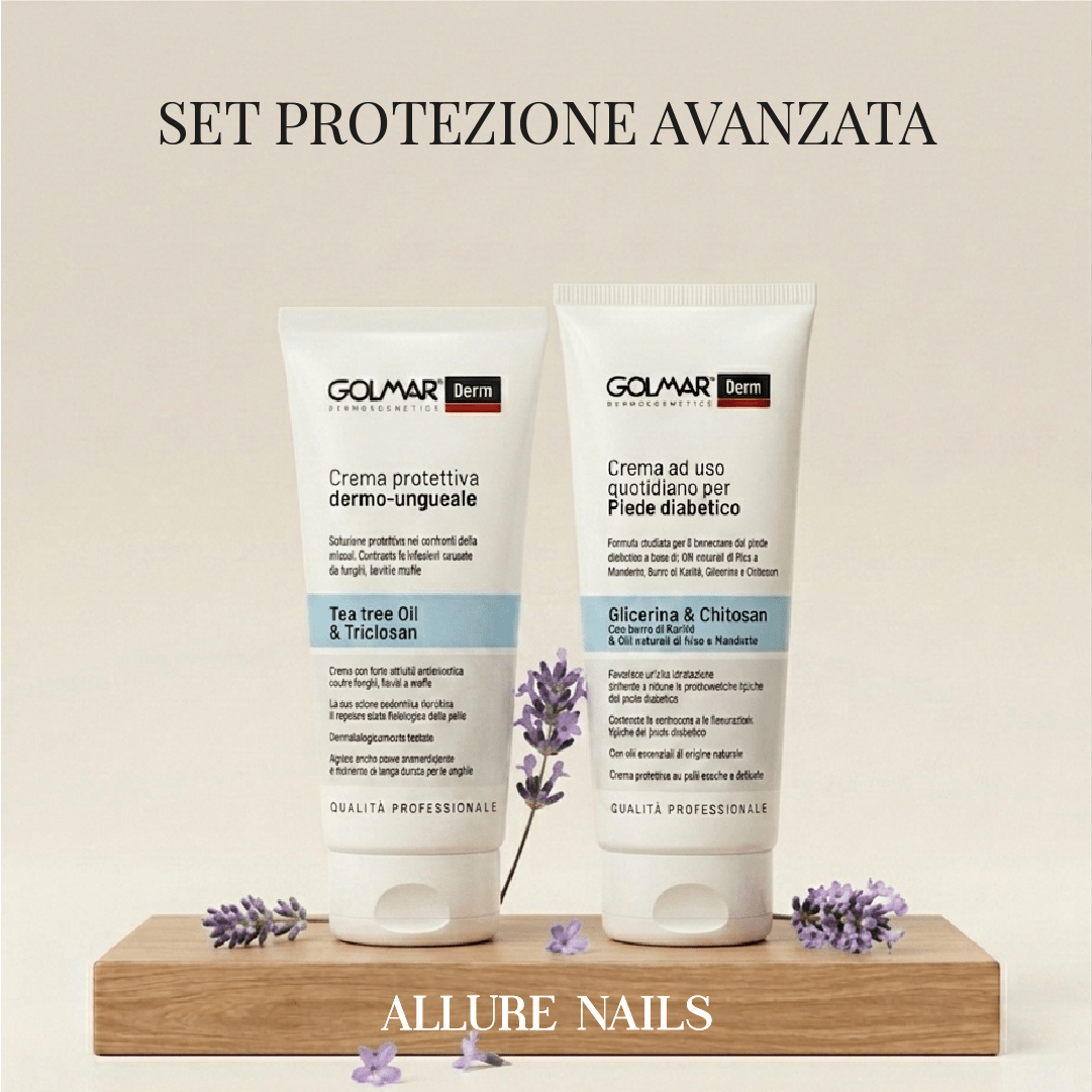 Kit pedicure professionale per piedi sensibili e piede diabetico. Include crema protettiva dermo‑ungueale Golmar e crema quotidiana Golmar per pelle fragile. Ideale per estetiste e trattamenti domiciliari sicuri.