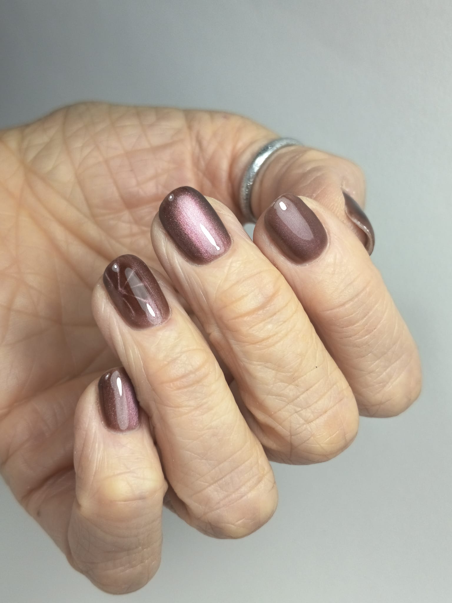 Smalto semipermanente Nutella Cat Eye 10 da 10 ml – marrone intenso con riflesso magnetico rosa. Brillantezza estrema e durata fino a 3 settimane.