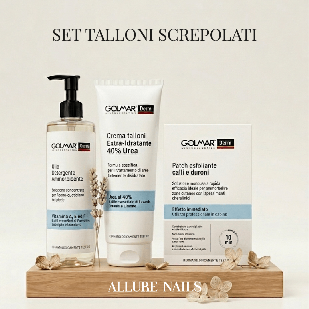 set talloni screpolati Golmar è stato formulato per offrire un trattamento completo, intensivo e professionale dedicato ai piedi secchi, ispessiti o con screpolature profonde. Questo kit combina tre prodotti tecnici ad alta efficacia: un olio detergente ammorbidente, una crema talloni al 40% di urea e patch esfolianti specifici per calli e duroni. È ideale per estetiste, podologi e clienti che desiderano un risultato immediato e visibile anche a casa.